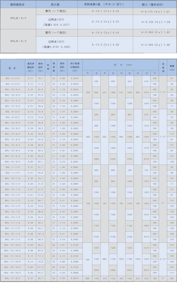 SRL型散热器共有37种规格,该散热器是采用钢管铝翅片管束组成,故铝片与钢管接触紧密,散热性能好,使用可靠。
